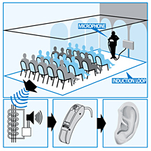 Microphones are key to making this technology work; a presenter speaks into the microphone and clear sound is delivered directly to the T coil located in the hearing aid. One simply pushes a button to access the T coil Program. Background noise is eliminated and the user is able to understand words clearly, as will anyone else with hearing aids or cochlear implants. Those who need hearing help who do don’t have hearing aids will benefit by wearing a loop receiver and headset. Hearing loops enhance sound to provide a full listening experience. - CART Technology