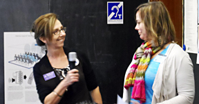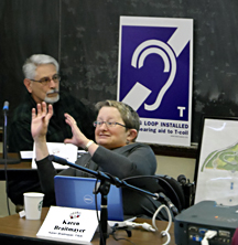 Lee Harper, Executive Director of PNA, asks Cheri Perazzoli, Lets Loop Seattle, to describe the Hearing Loop.