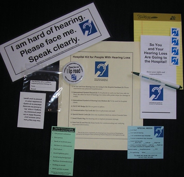 In Washington State, HLAA-WA developed hospital kits several years ago to empower people with hearing loss to advocate for themselves in healthcare settings. The kit includes a button that says “Please face me, I lip read,” plus a card that says, “I am hard of hearing. Please face me. Speak clearly.” Advocates Karen Utter and Judi Carr worked with the Swedish medical system to make similar kits available for everyone.