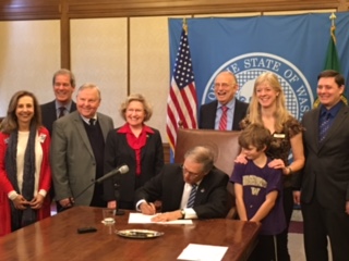 Governor Inslee signs SB 5179 while Senator Bailey, Walt Bowen, Joanna Grist, Rep. Goodman, Senator Conway, and others look on.